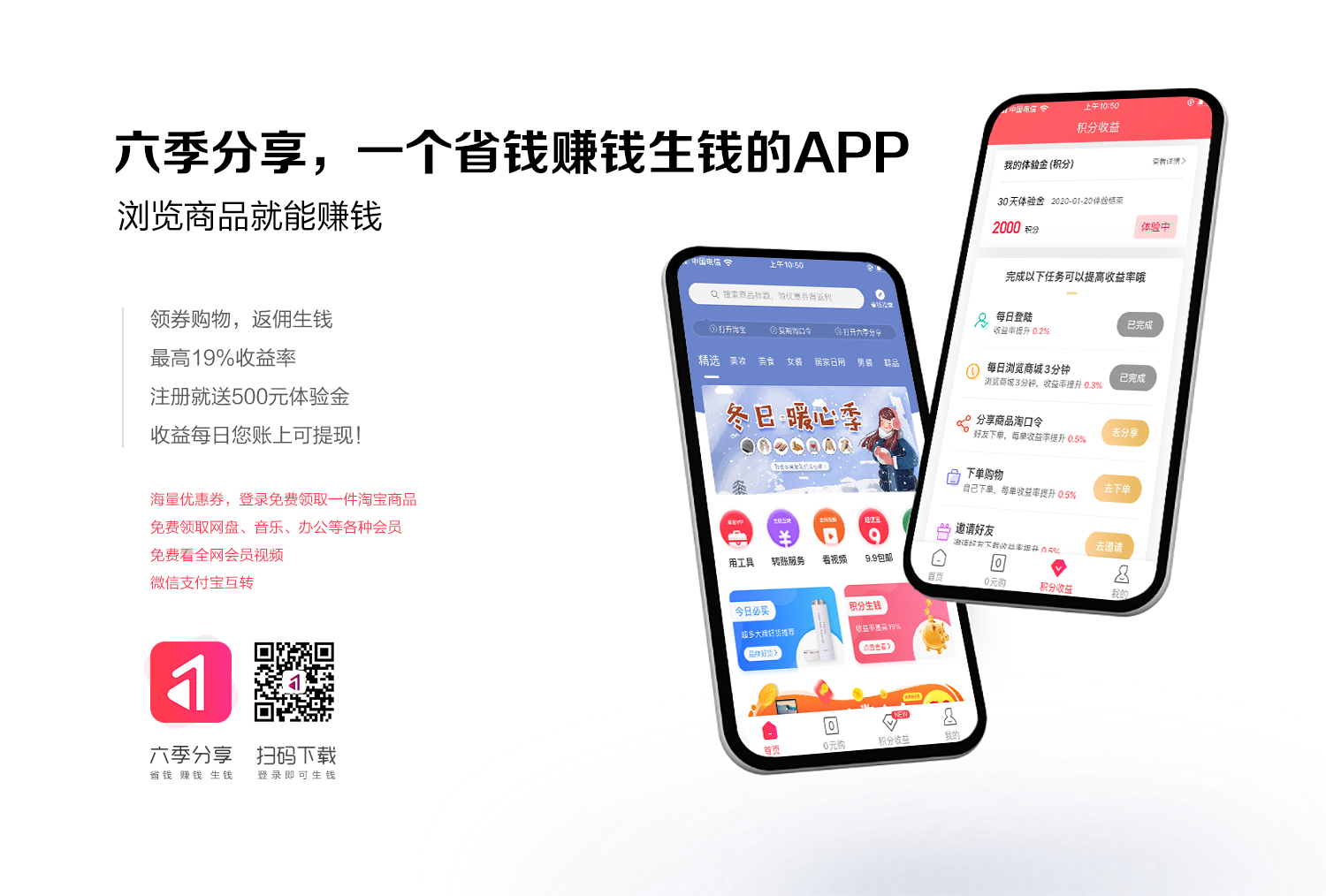 一次偶然的机会,在好友分享的朋友圈内容里发现了六季分享APP。朋友在六季分享APP领了1000元券后在淘宝仅花299元就买了一件高端羽绒服,省了1000钱,还获得了200元的返佣,他又把这200元返佣留在六季分享通过‘积分收益’,每天又获得1毛钱的收益,我心想,同样的金额存入余额宝一天只能领2分。还有这么好的事?怀着好奇的心理,我也去下载了这个APP,开始慢慢了解。