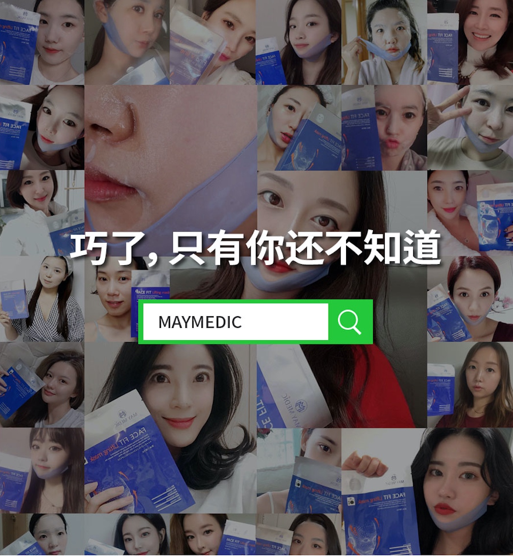 玫美德(May Medic)独创的明星产品“面部提拉面膜”,在韩国社交媒体上被众多博主推荐,曾达到月销98000片的销售神话。独创的V脸提拉带,采用婴儿用奶嘴硅胶制成,在紧密贴合下颚的同时,保证绝对的舒适与安全性,并可在日常工作生活中使用,真正达到时刻提升脸部轮廓的效果。